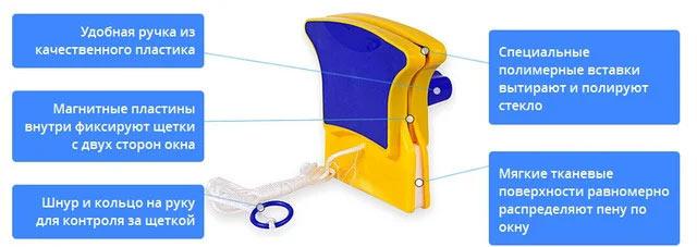 Щетка с магнитами не представляет из себя сложного устройства, но как мы знаем, все гениальное – просто! Ее конструкция – это просто две щетки, но главное их свойство – магниты. Щетки притягиваются друг к другу, и между ними помещается стекло.