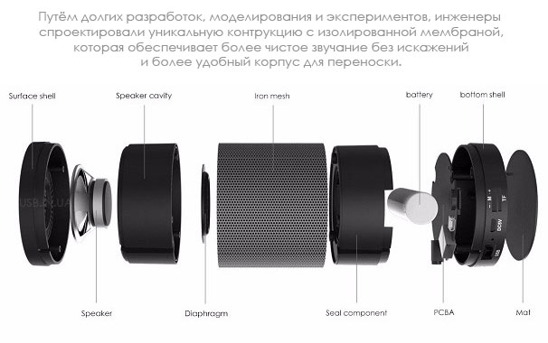 - Bluetooth- бездротове підключення до джерела звуку з підтримкою "гучного зв'язку" (вбудований мікрофон і прийом дзвінка кнопкою на міні-колонці)